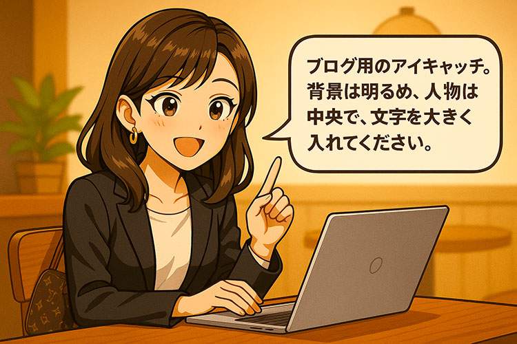 - 「ブログ用のアイキャッチ。背景は明るめ、人物は中央で、文字を大きく入れてください。」