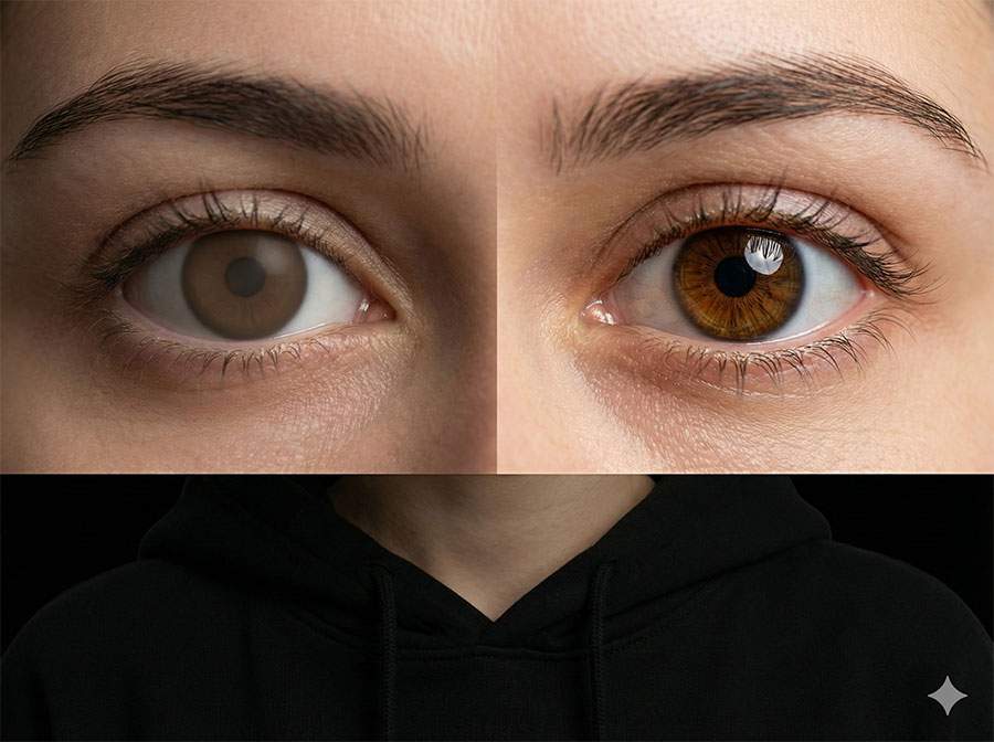 extra pupils, deformed pupil, asymmetric eyes, cross-eyed, multiple catchlights, overexposed highlights, plastic eyes, doll eyes, smeared iris, blurry eyes, low detail eyes, pure white sclera, heavy veins, glitter everywhere, text, logo, watermark