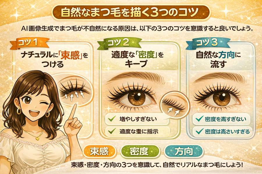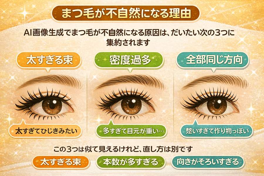 AI画像生成でまつ毛が不自然になる原因は、だいたい次の3つに集約されます。
