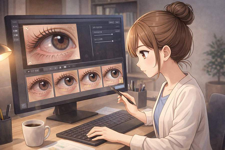 白目だけ整えても、周辺とのつながりが悪いと自然には見えません。まつ毛、まぶた、涙袋、黒目の光、肌の質感まで含めて見たときに、白目だけが別パーツのように浮いていないかを確認することが大切です。