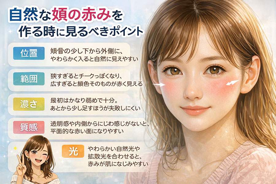 まず知っておきたいのは、頬の赤みは単純に「赤を足せば良い」という要素ではないことです。自然に見えるかどうかは、色だけではなく、位置、広がり方、光、肌の質感までセットで決まります。
