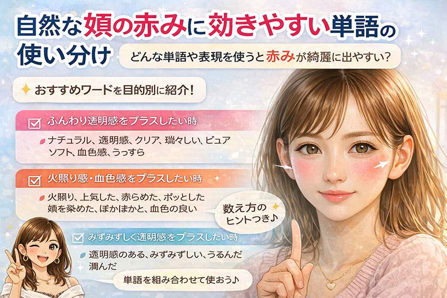頬の赤みは地味に見えて、顔全体の印象を整えるかなり強いパーツです。健康的に見せたい時、やわらかい表情を作りたい時、透明感のある肌に見せたい時のどれにも効いてきます。まずは弱めの単語から試し、出てきた結果を見ながら少しずつ調整していくのが、一番失敗しにくい進め方です。