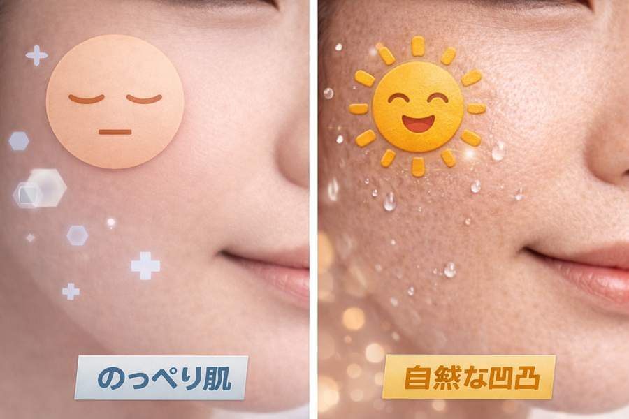 初心者が失敗しやすいのは、形と陰影が弱いまま、質感ワードだけを盛るパターン。これをやると、ただ毛穴だけが浮いて見えたり、肌荒れっぽく見えたりしやすい。