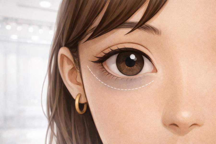 涙袋の下の影を少しだけ深くする、灰紫の色味をほんの少し足す、下まぶたのむくみを軽く足す、顔全体の明るさを少し下げる