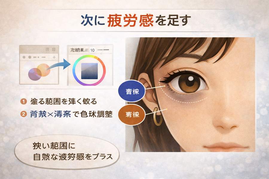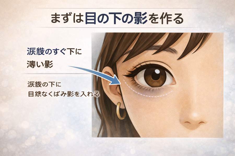 ここでいきなり青や茶色を強く入れるより、先に「目の下が少しだけ落ちて見える立体」を作った方がうまくいきます。