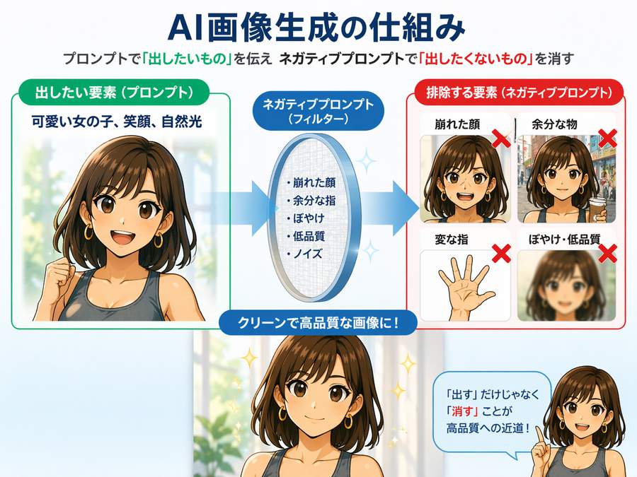 この記事では、ネガティブプロンプトの基本から、すぐ使えるテンプレ、失敗しないコツまでまとめてるから、そのままコピペでOKな状態にしてある。
