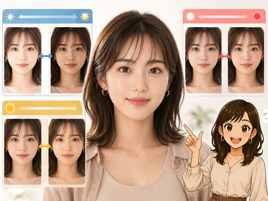 明るさ、黄み、赤み、血色、光の当たり方、このあたりを少し整理するだけで、同じ人物でも一気に完成度が上がる。