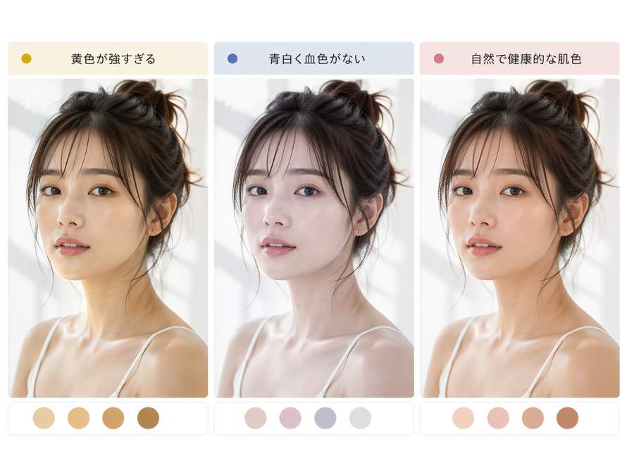 白すぎて病的に見えたり、黄色が強すぎて古いフィルターみたいになったり、赤みが乗りすぎて顔だけ火照って見えたり。